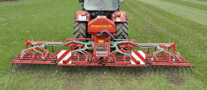 Pour les soins, le réensemencement, le sursemis ou l’ensemencées le PNEUMATICSTAR-PRO est un appareil parfait. Le PNEUMATICSTAR-PRO est une évolution du PNEUMATICSTAR très connu et vendu à des milliers d’exemplaires. Ce dispositif, conçu spécifiquement pour l'agriculteur professionnel ou pour l’entrepreneur, fournit un meilleur développement des enchevêtrements, avec ses dents il stimule les herbages de manière plus intense et ferme les lacunes par le semoir pneumatique monté au dessus le tout en un seul passage. De cette manière la repousse de mauvaise herbe est empêchée